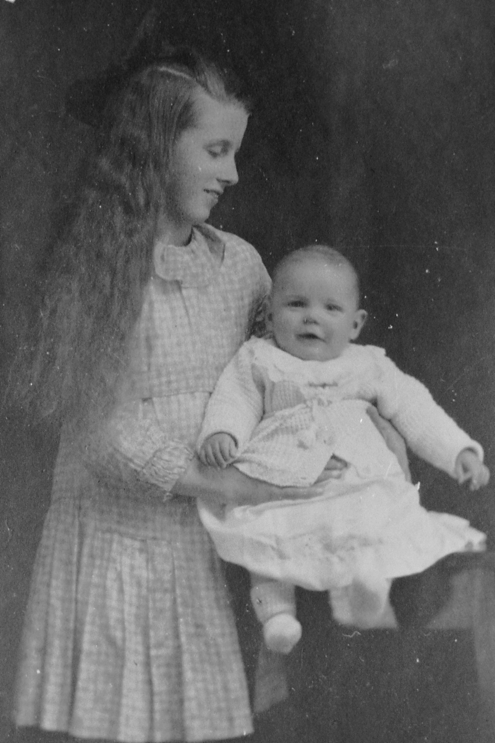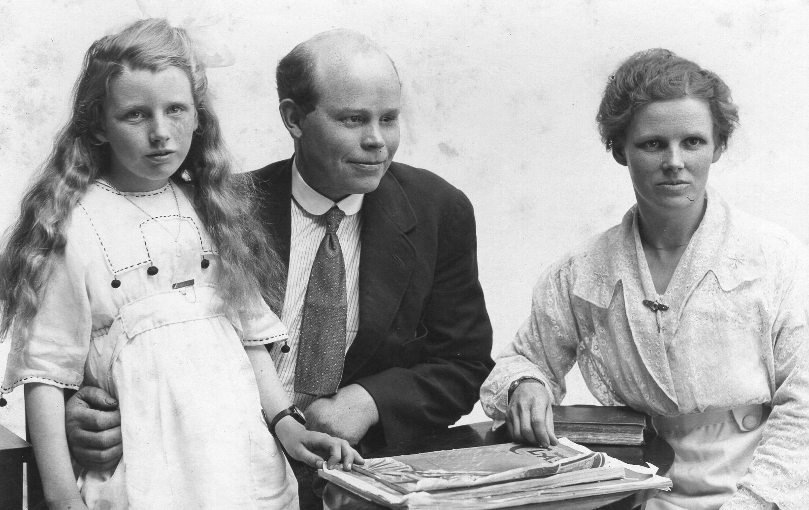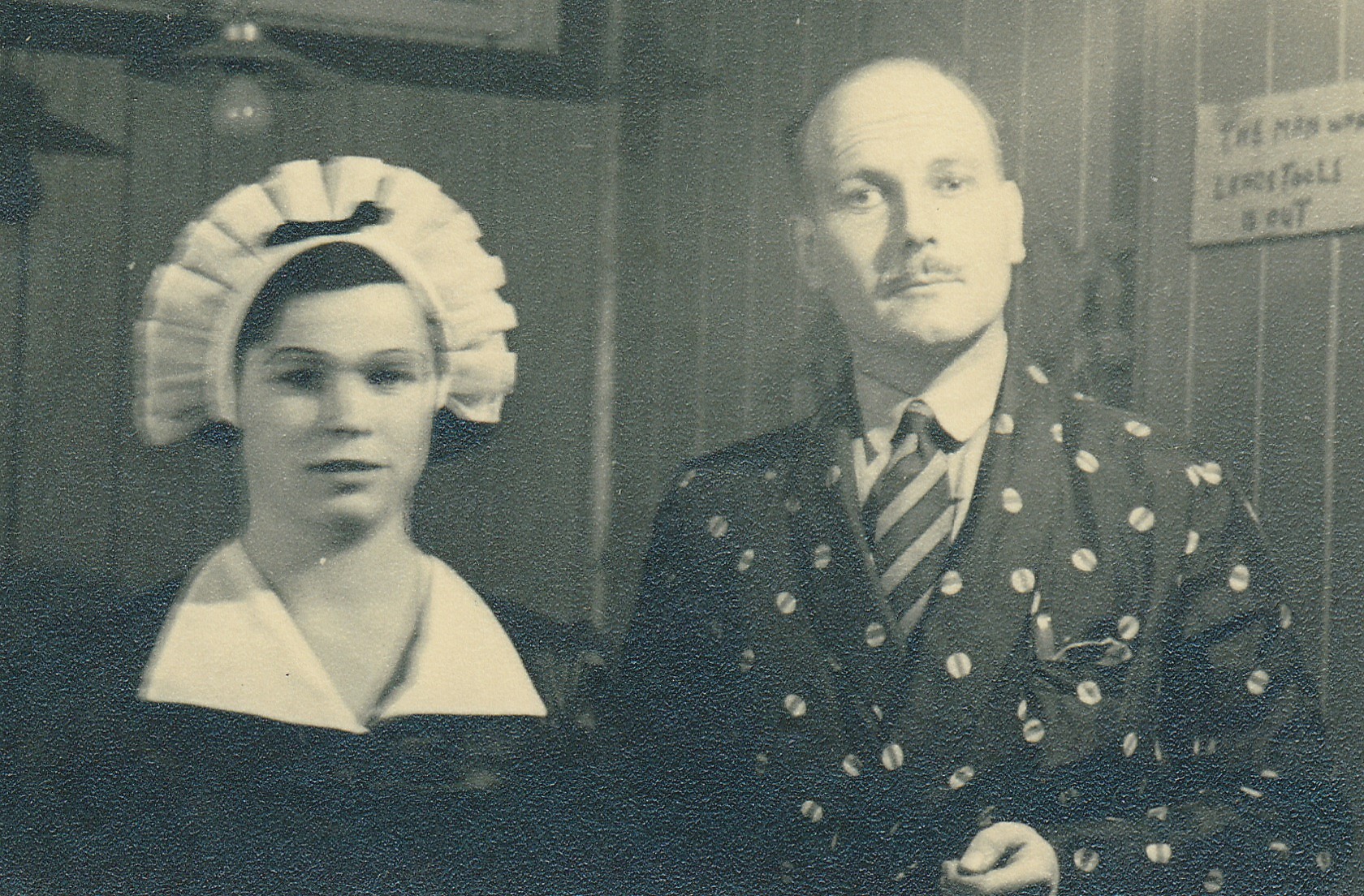 Arnold parents - Anton and Lillian - and older sister Hazel Arnold and his older sister Hazel Arnold as a maid for a play at Stalag Luft III