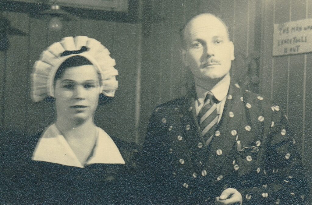 Dear Mum. Do you remember that I told you I’d been a maid in a play? Well, I’m attaching a photo of the occasion – not a very good one, since I moved, but I hope it arrives as safely as the last one. I’m rehearsing for two more plays at the moment, as a maid in both of them, so maybe I have a permanent job for the duration. It still looks like a long business, but every P.O.W. always says, “it’s bound to finish next year,” so here’s hoping. Tell Hazel Maud(e) her photo and two letters have arrived safely, and that I was very pleased to have them. Should I be polite and say the baby looks like its father, or be honest and say I don’t see any resemblance to anyone in particular. However, by the time I see it in the flesh we will be able to decide much better. The mail hasn’t been coming my way recently, but now Spring is on the way, who can tell? Maybe it will start pouring in! Love to you all from Arnold G.